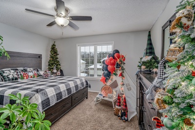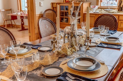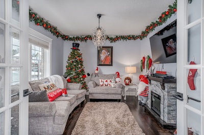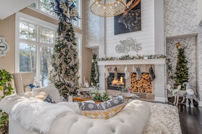 Gold, white, and crystal ornaments along with white lights will adorn this farmhouse-style home built in 1953. Its country chic decorating style uses metal, wood, leather, and cloth. Two master suites are featured on the main floor. Although the main living area is an open-concept, private spaces stem from the open area, giving it a cozy atmosphere.