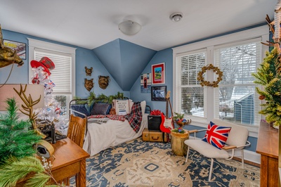 “Christmas around the world” is the theme in this cottage/farmhouse home built in 2024, with each room representing a different country. A three-season porch features a suspended swing. The living room and kitchen feature wooden beams and high ceilings. A hidden room is accessed by a large Murphy door. Expansive windows offer views of a picturesque, wooded five-acre lot.