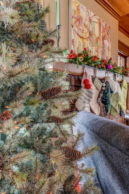 The Christmas decorations of this 1950s Scandinavian-style cabin, which was significantly remodeled in 2000 and 2005, reflect the joy of the season of snow and ice. The design incorporates simplicity, practical functionality, integration with its natural surroundings, and a palette of light colors. The home reflects the family’s love of all things winter.